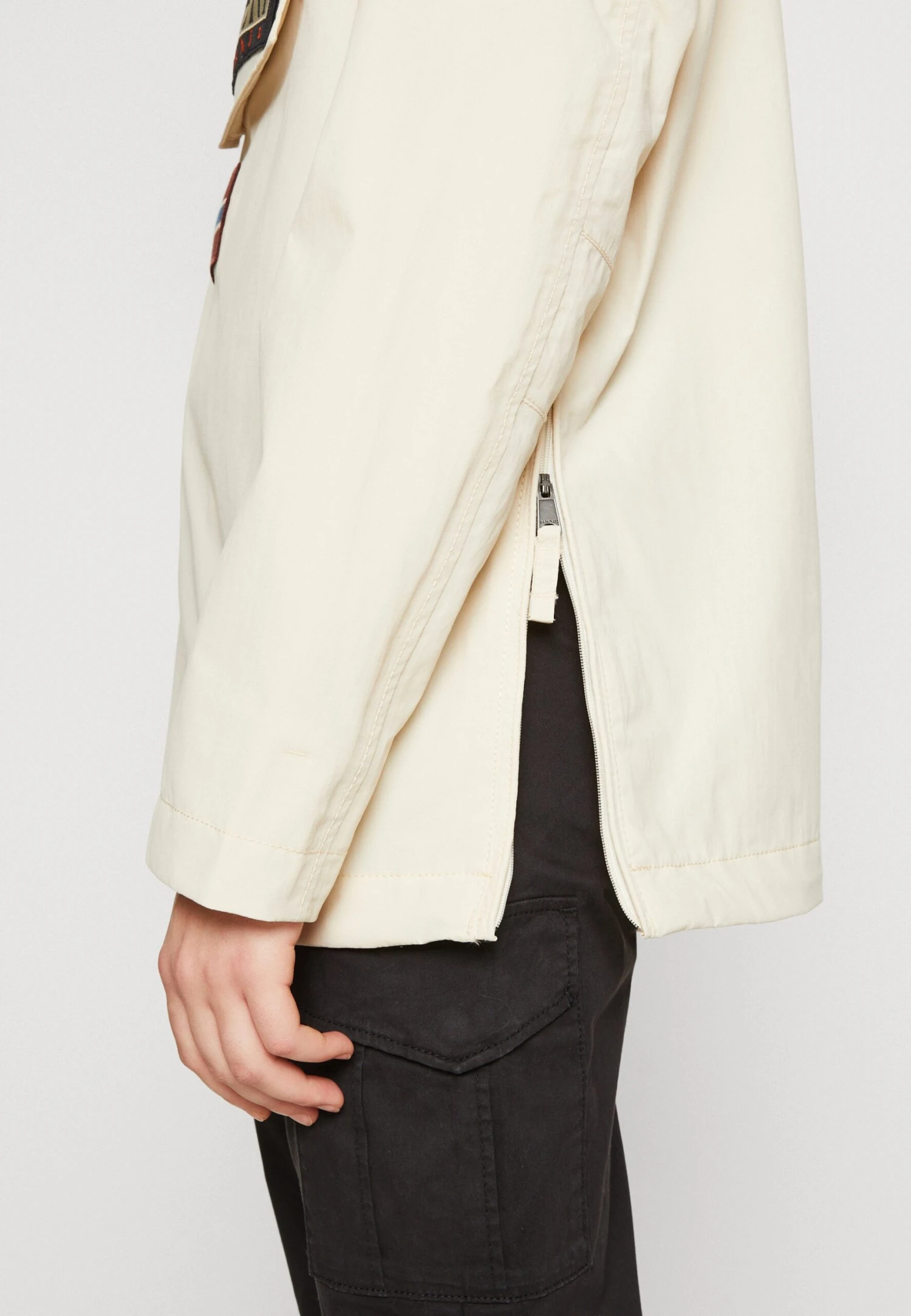 | Details | Ritssluiting, elastische tailleband, borduurwerk |